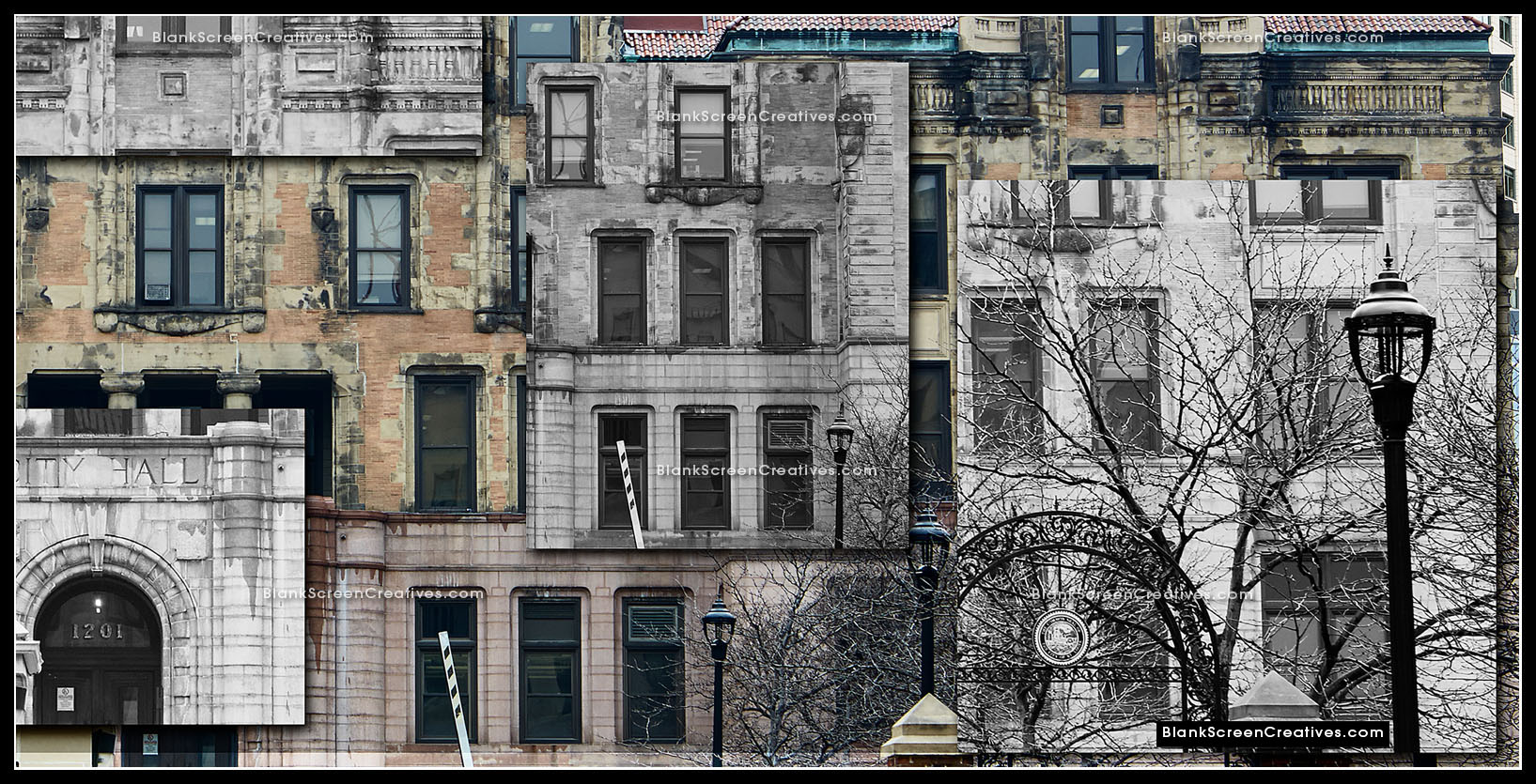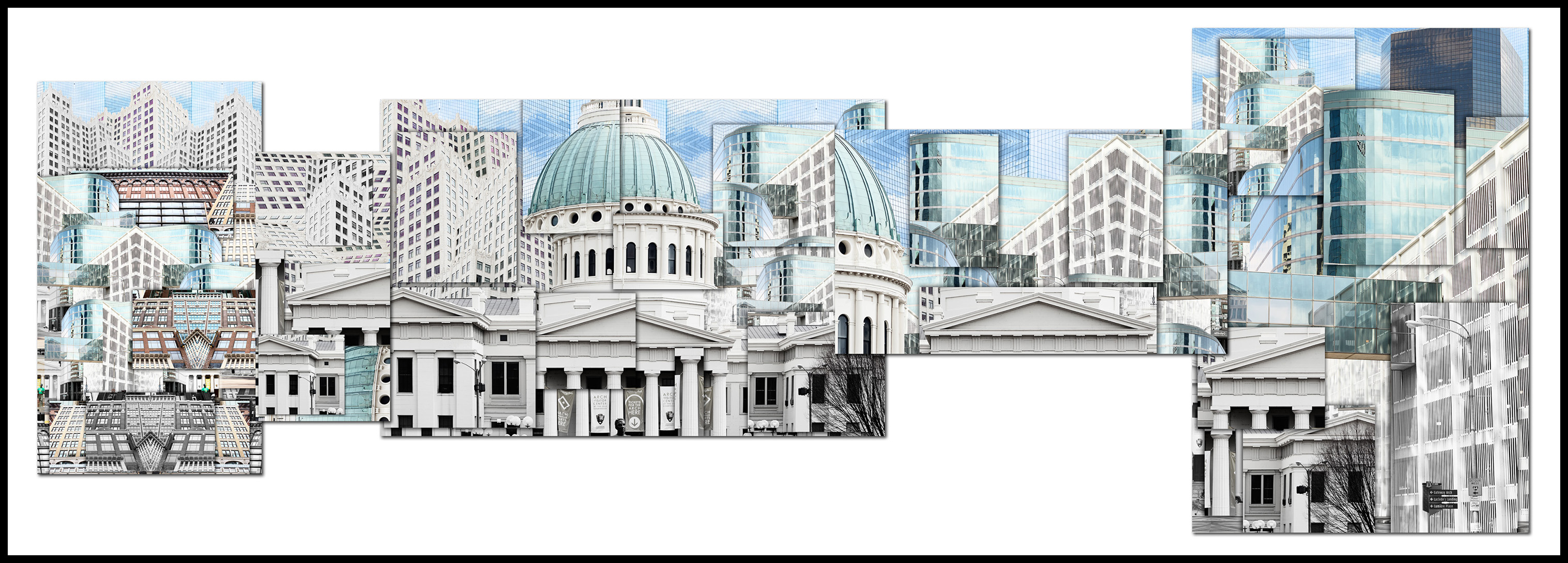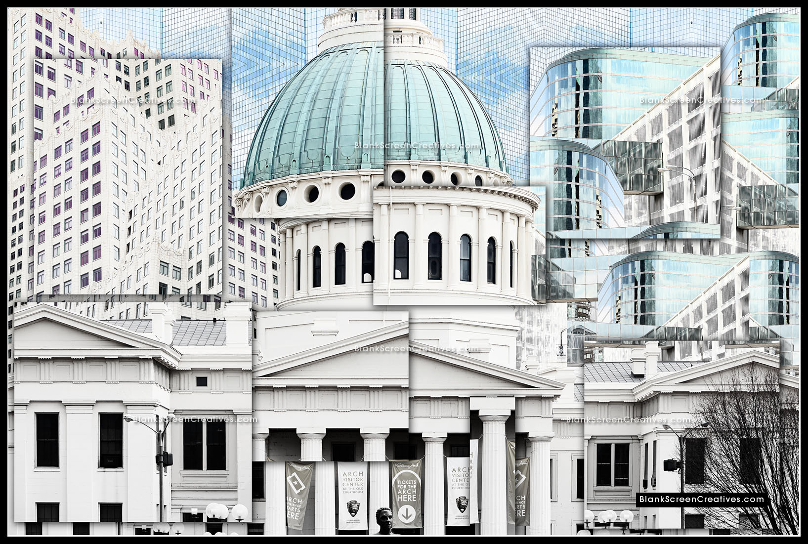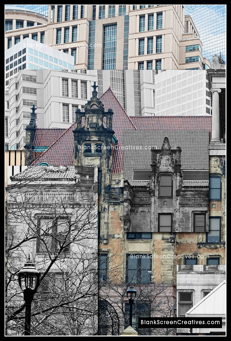 Nervous, but at the same time knowing this project was the culmination of countless late nights spent creating while exploring my imagination, I accepted the challenge and immediately went into action mode. The piece had to be created from photographs of old and new St. Louis architecture. An added challenge was that it was the end of February and we had to deliver the final in April which might not sound bad until you consider the cold winter had left the city lifeless and grey. The budget allowed for 4 days on the ground in St. Louis for photography so I quickly booked my flights. As the trip approached I learned the forecast for those days was in the 20's and raining which made the weight on my shoulders quickly increase.