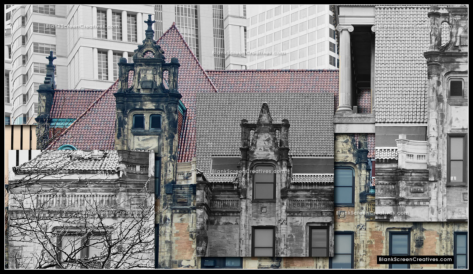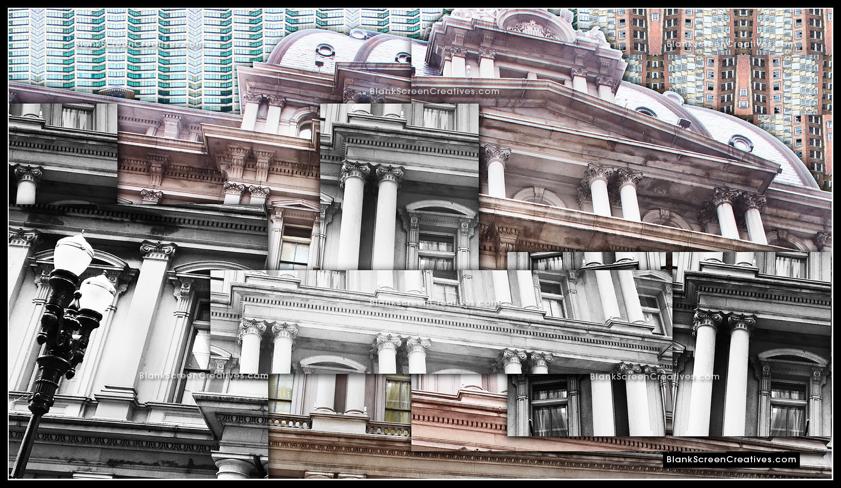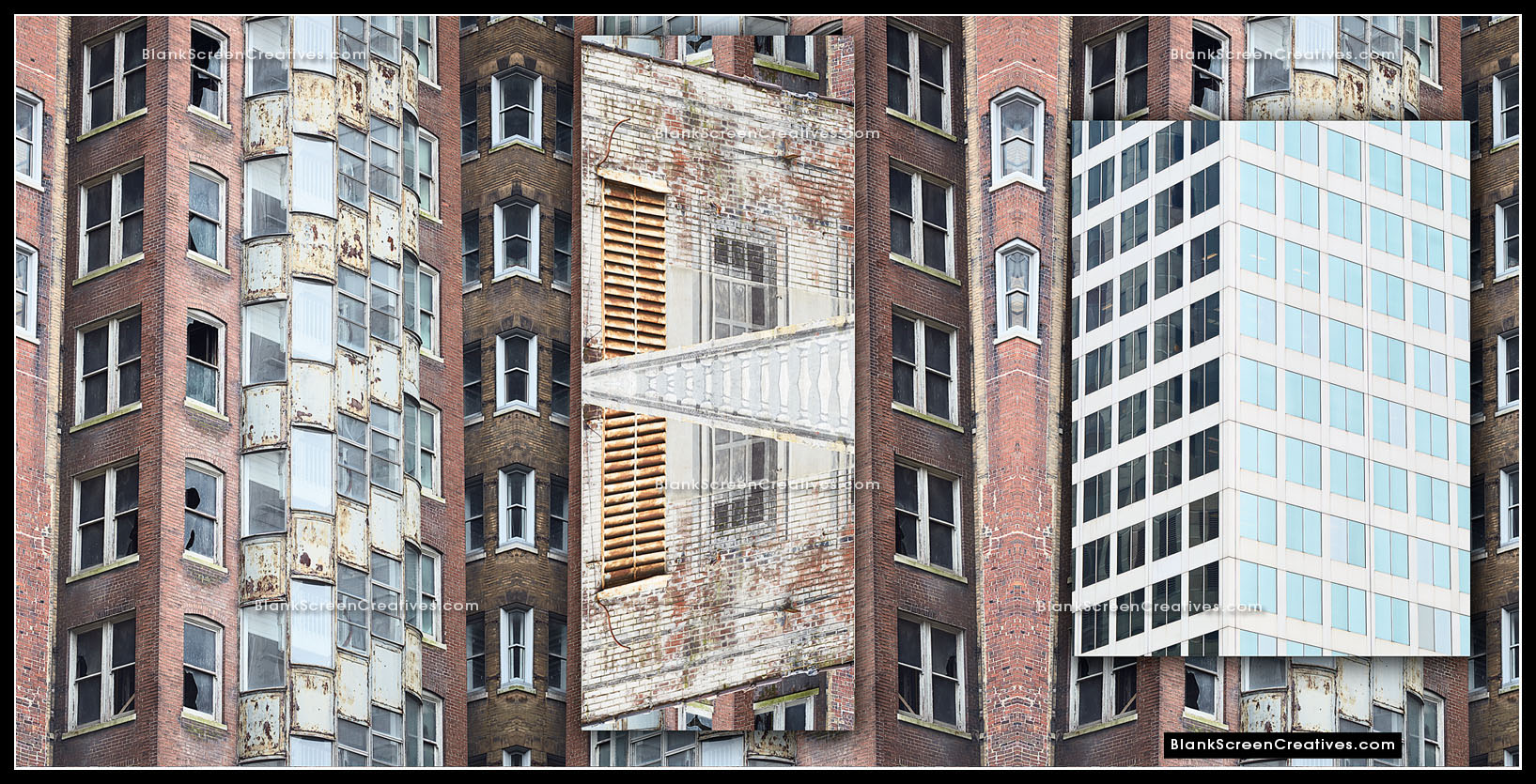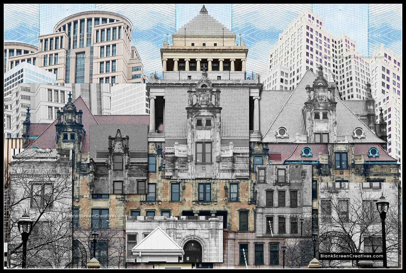 Nervous, but at the same time knowing this project was the culmination of countless late nights spent creating while exploring my imagination, I accepted the challenge and immediately went into action mode. The piece had to be created from photographs of old and new St. Louis architecture. An added challenge was that it was the end of February and we had to deliver the final in April which might not sound bad until you consider the cold winter had left the city lifeless and grey. The budget allowed for 4 days on the ground in St. Louis for photography so I quickly booked my flights. As the trip approached I learned the forecast for those days was in the 20's and raining which made the weight on my shoulders quickly increase.